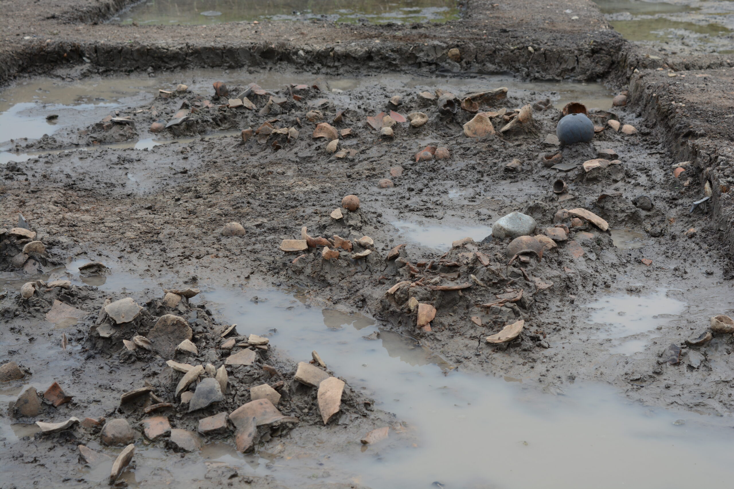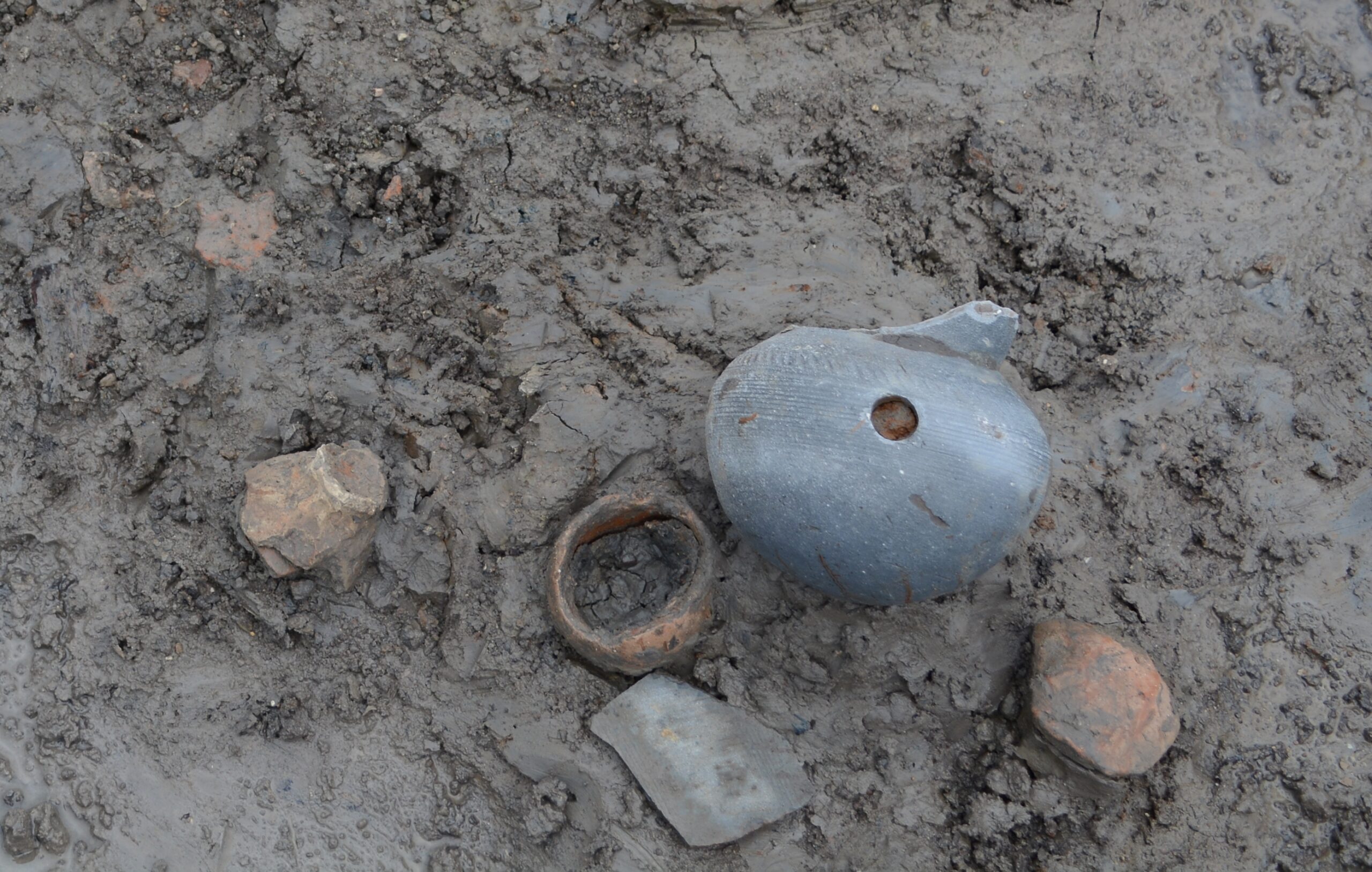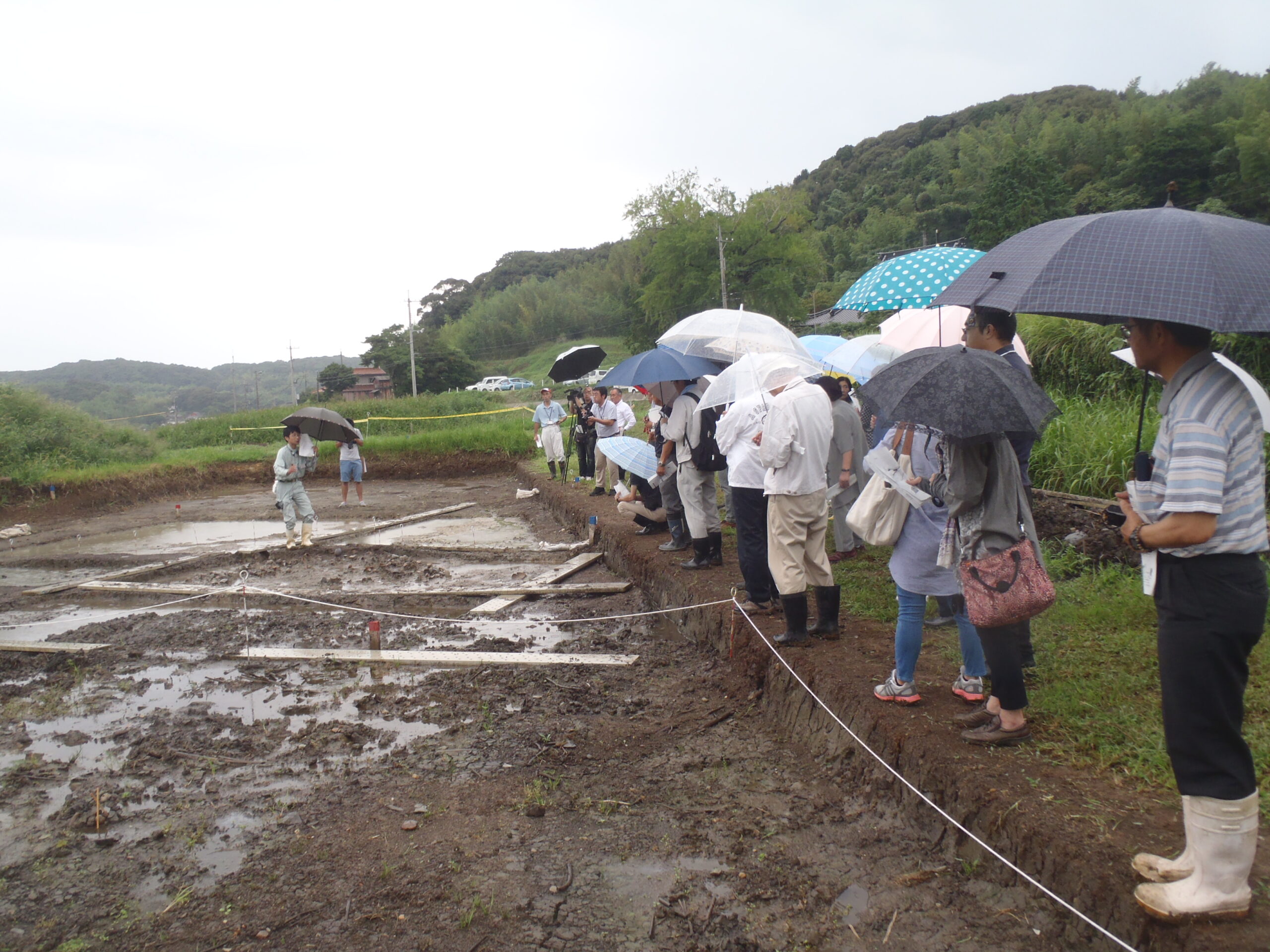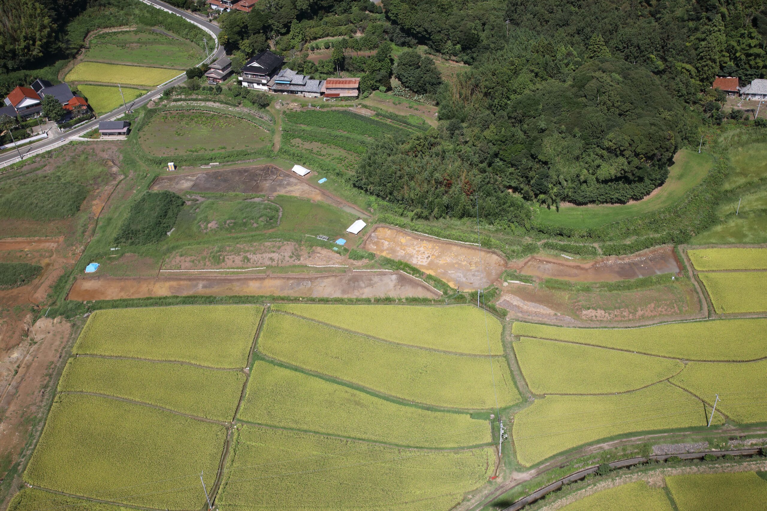 本郷遺跡は、向津具半島最大の本郷盆地に位置する古墳時代後半期(5世紀後葉~6世紀前葉)を主体とする集落遺跡で、柱列跡、土坑、柱穴等を確認しました。隣接する湿地からは、須恵器や多数のミニチュア土器をはじめ、滑石製模造品を含む祭祀跡を検出したことから、集落内で水辺祭祀が行われていたことがわかりました。