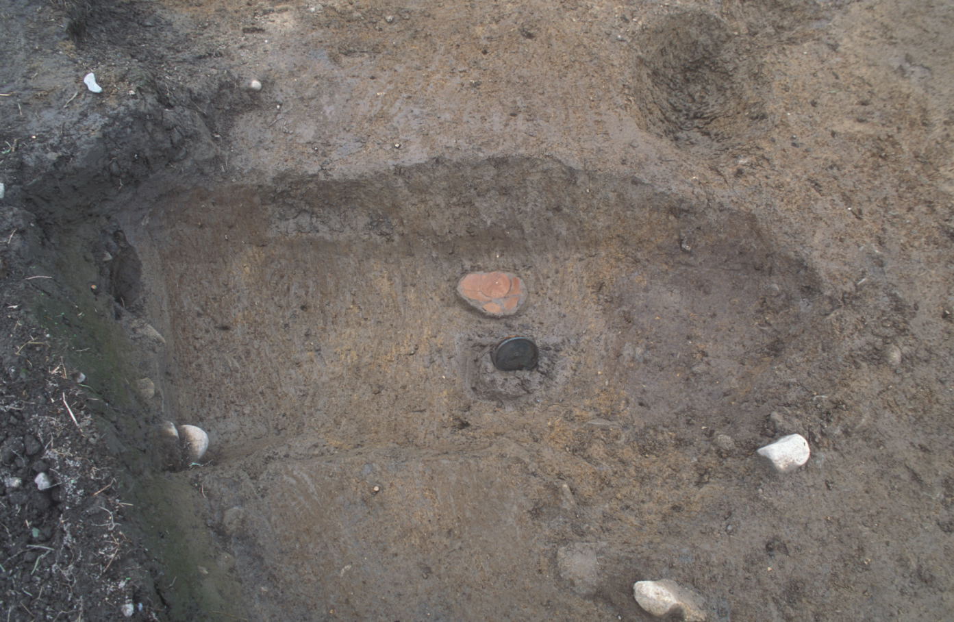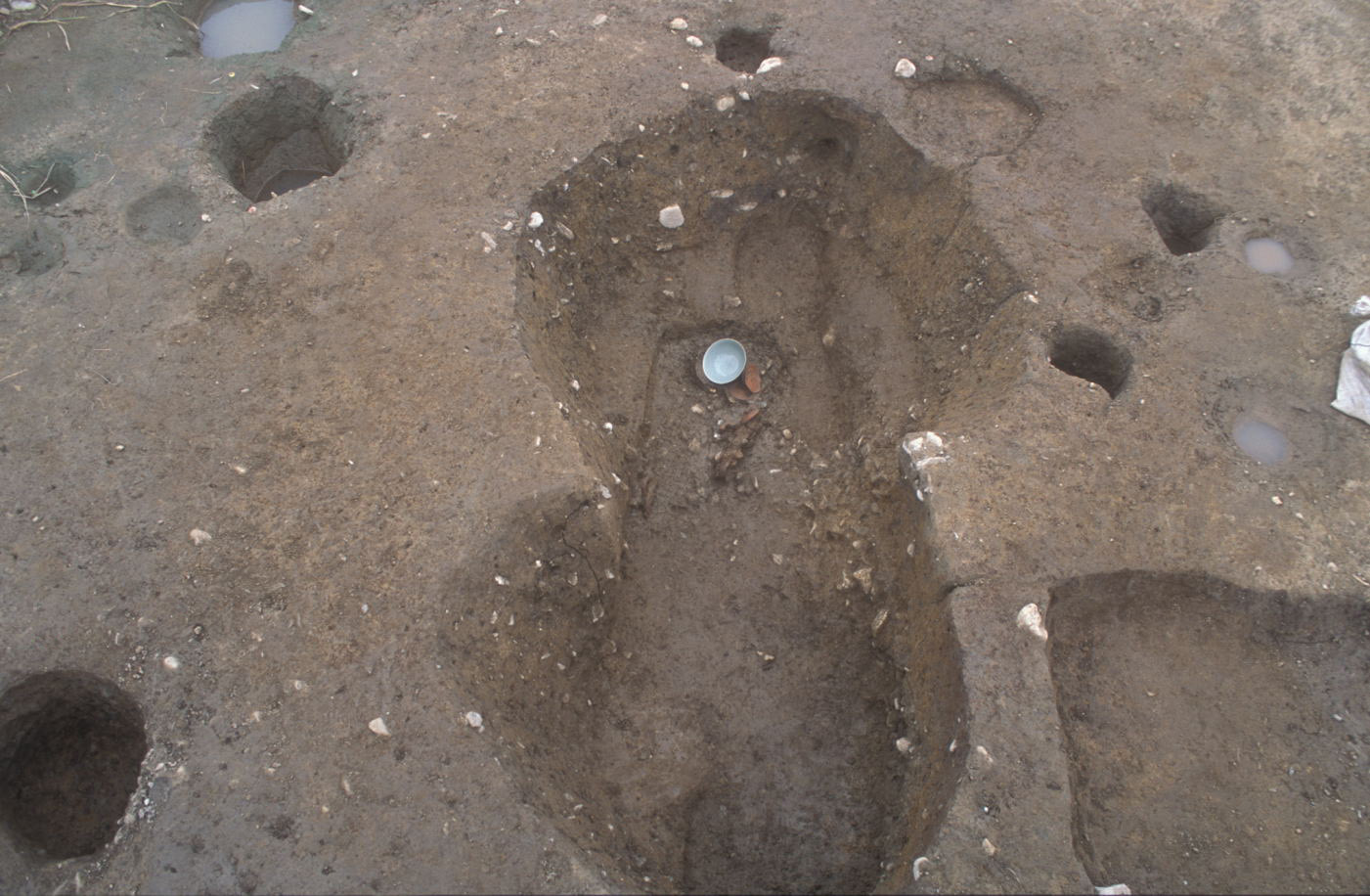 奈良・平安時代の出土遺物としては製塩土器や緑釉陶器が出土しており、幅広い流通および官衙的な役割をもった施設の存在をうかがわせます。また、鎌倉時代の墓からは副葬品として青磁椀や土師器皿と共に銅鏡(和鏡)や雁又式鉄鏃、鉄小刀等が出土しており、被葬者は地域の有力者と考えられます。平成26年度調査区の南西部には奈良・平安時代の遺構、中央部には鎌倉・室町時代の遺構が密集しており、居住地をわずかに移動しつつ継続的に生活が営まれていたことが推察できます。
