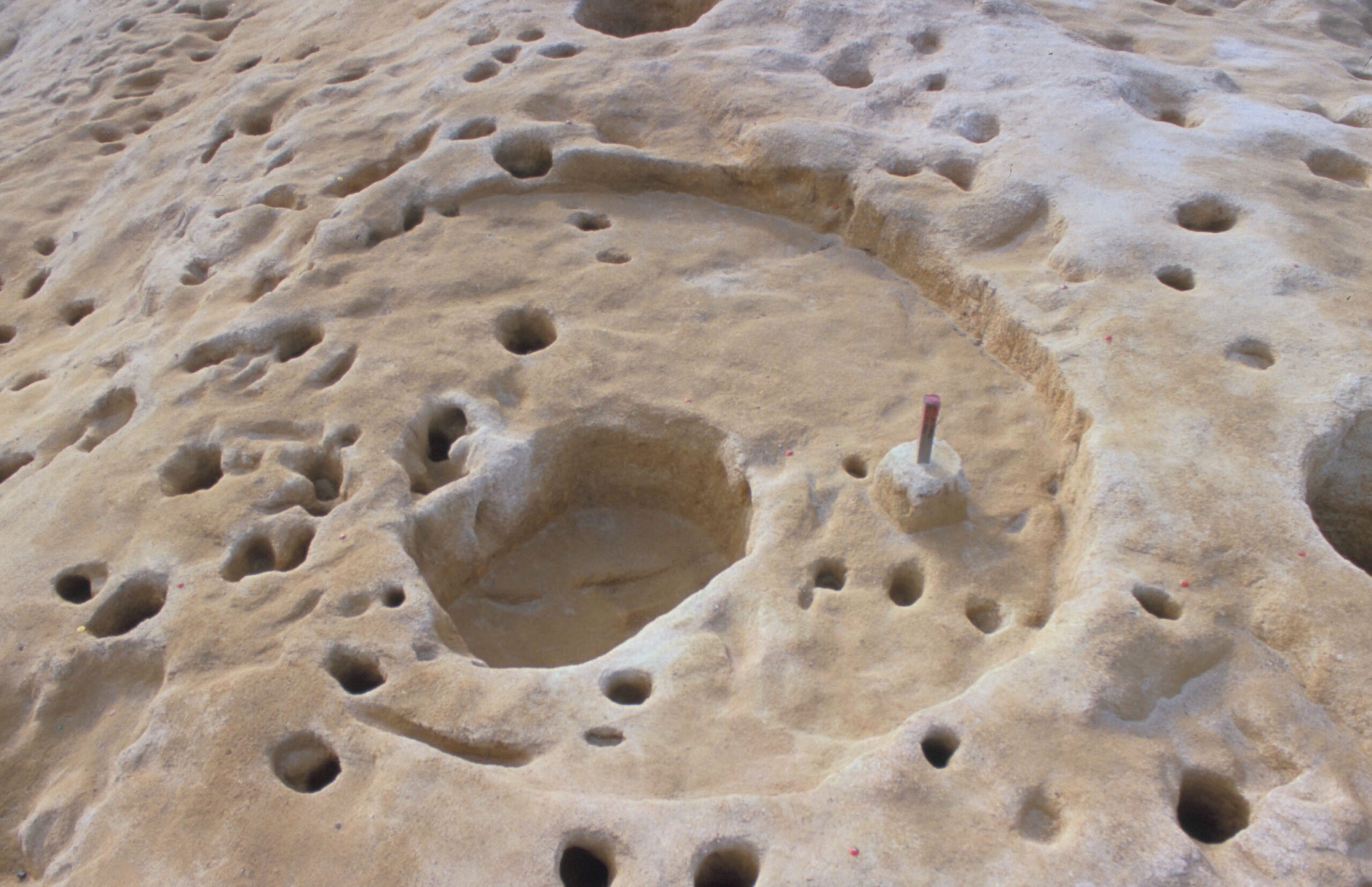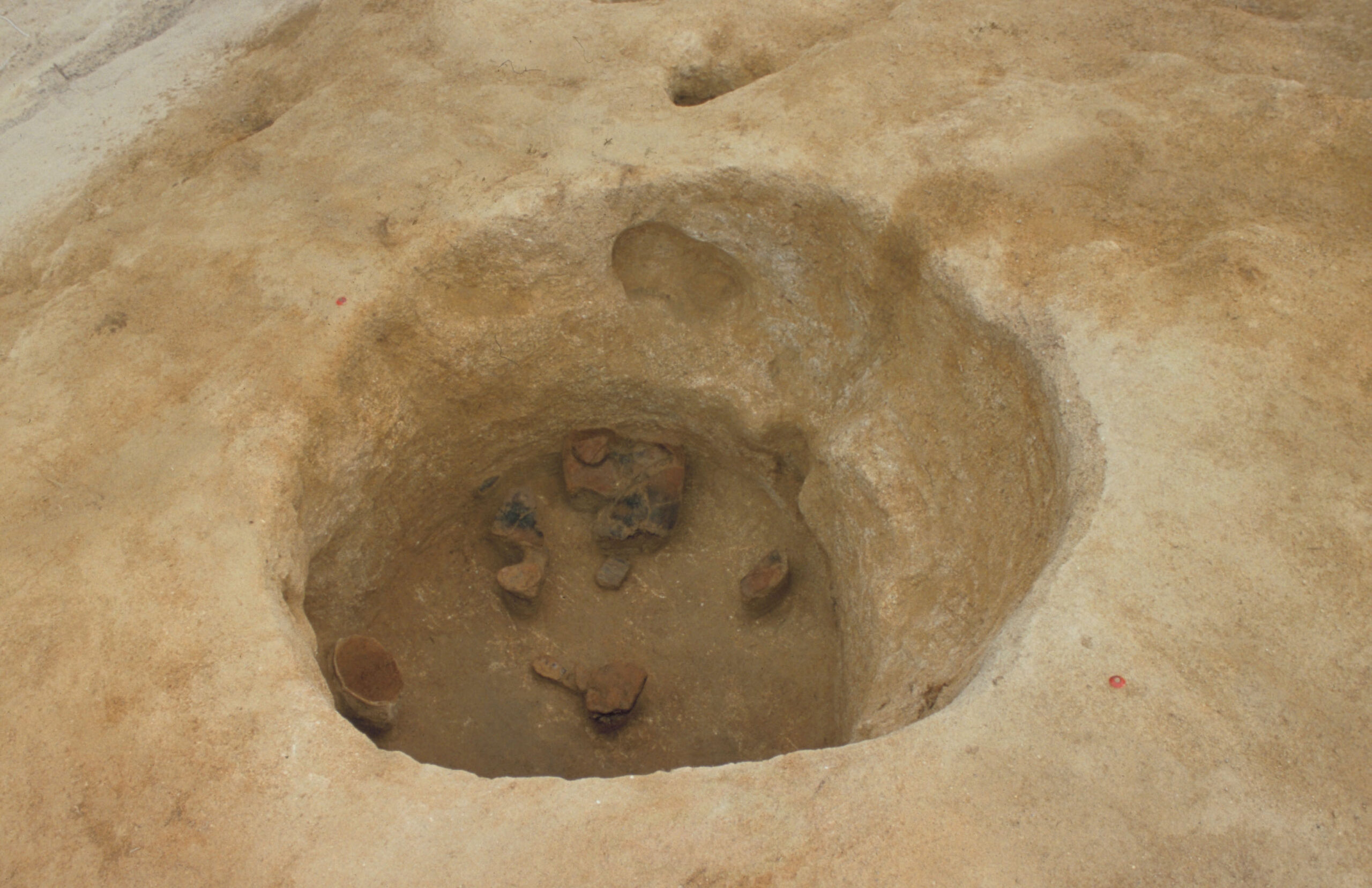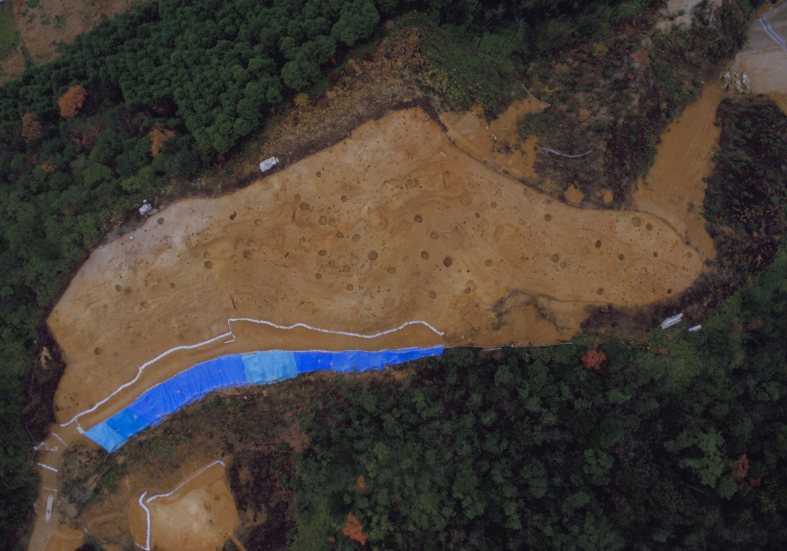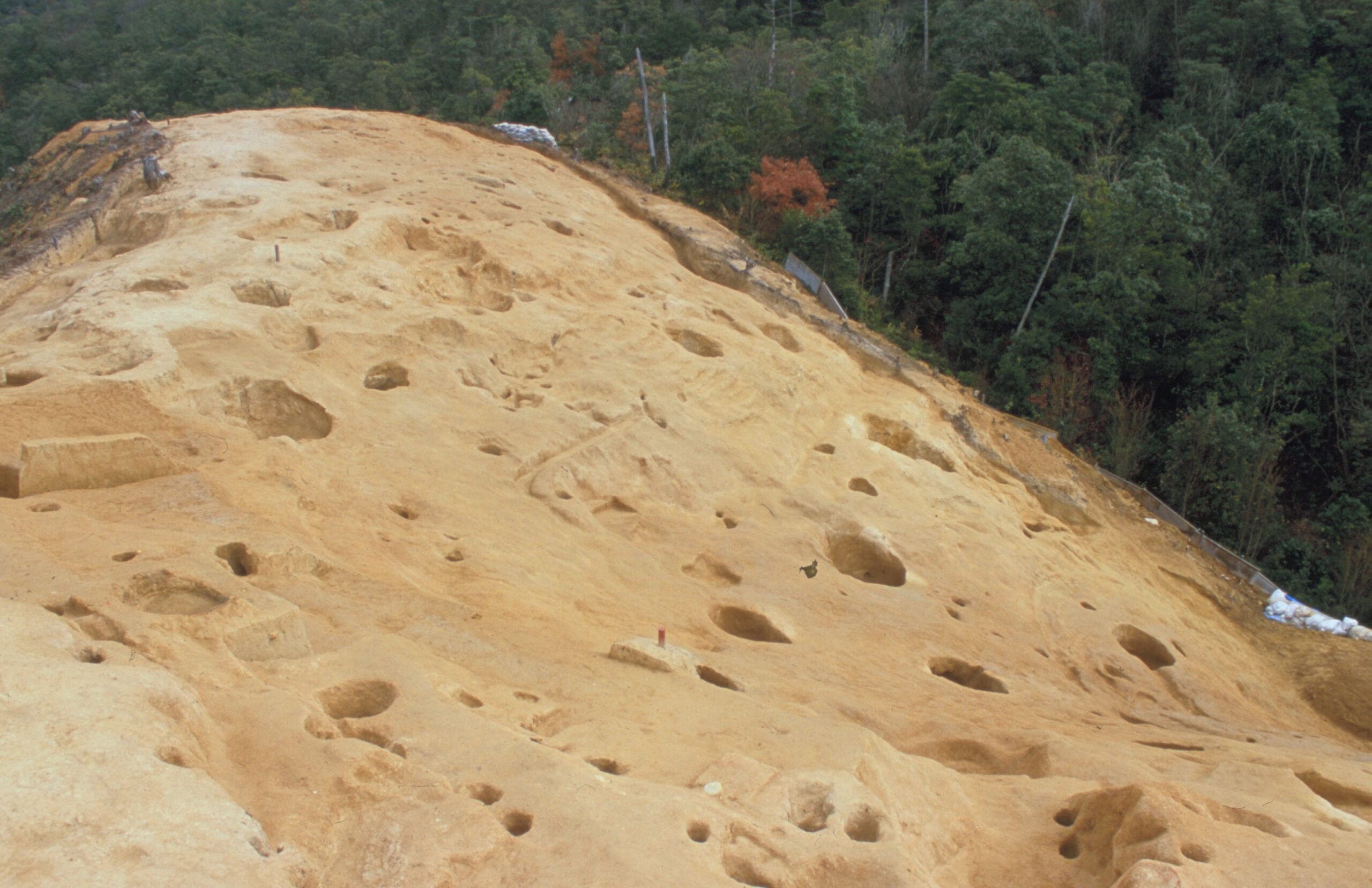 真尾猪の山遺跡は、佐波川左岸の丘陵頂部とその麓の斜面に発見された弥生時代中期の集落跡です。竪穴建物15棟、土坑156基など多くの遺構が確認されました。特に頂部の集落は比高40mに位置する高地性集落です。発見された土坑の多くは貯蔵用とみられ、炭化した種子や米がまとまって出土したものもあります。また急斜面をL字状に掘削した段状遺構もあり、狭い尾根筋だけでなく、斜面も生活の場として利用する工夫がみられます。ふたつの集落は同時期に営まれたとみられ、当時貴重であった鉄器を多く保有していることから、佐波川中流域の中心的な集落であったと考えられます。