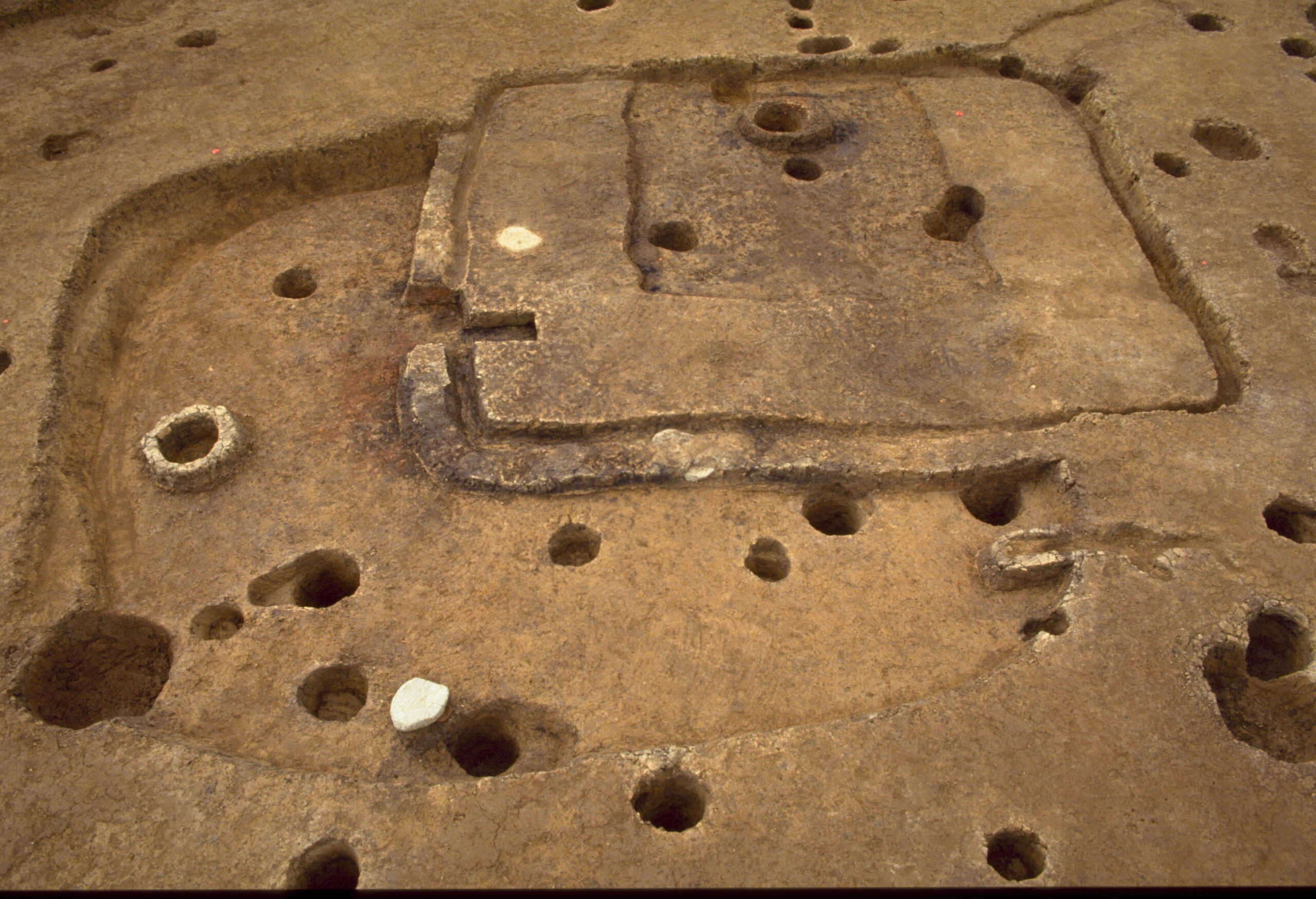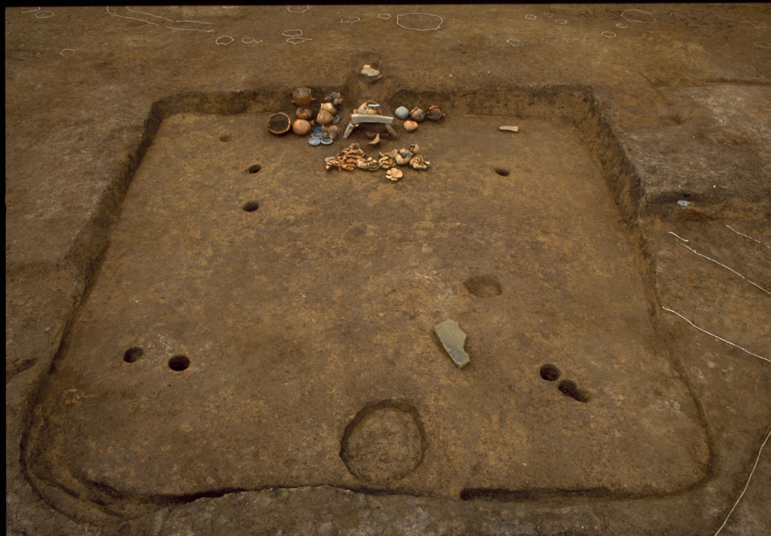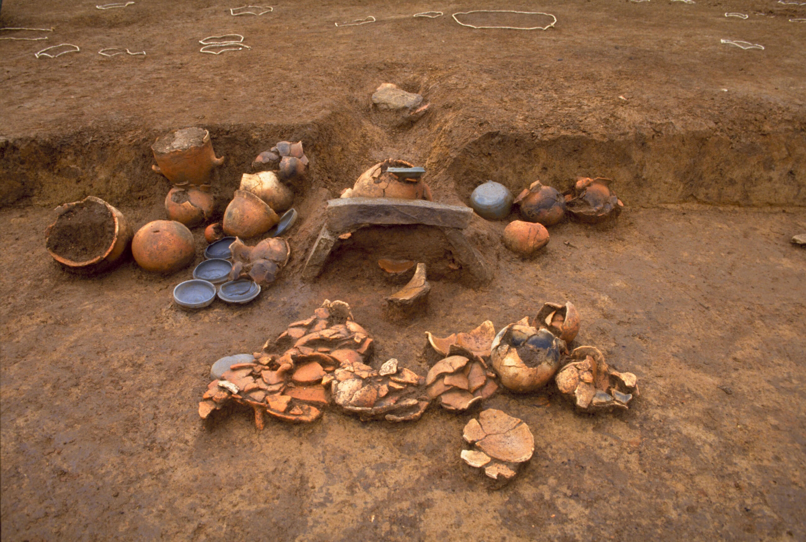 上ノ山遺跡は、弥生時代から古代の集落跡です。このうち注目されるのが古墳時代後期の竪穴建物で、作り付けのカマドを有していました。これらのカマドは住居廃絶時に意図的に破壊されるなどの祭祀行為が行われています。特にSB7ではカマド内およびその周辺に約30点の土師器、須恵器が意図的に置かれた状態で出土しており、カマド祭祀の特徴をよく示しています。また8世紀の銅製錬にかかわる遺構遺物も発見されていることから、当時の美祢地域における金属生産の状況を考える資料となりました。